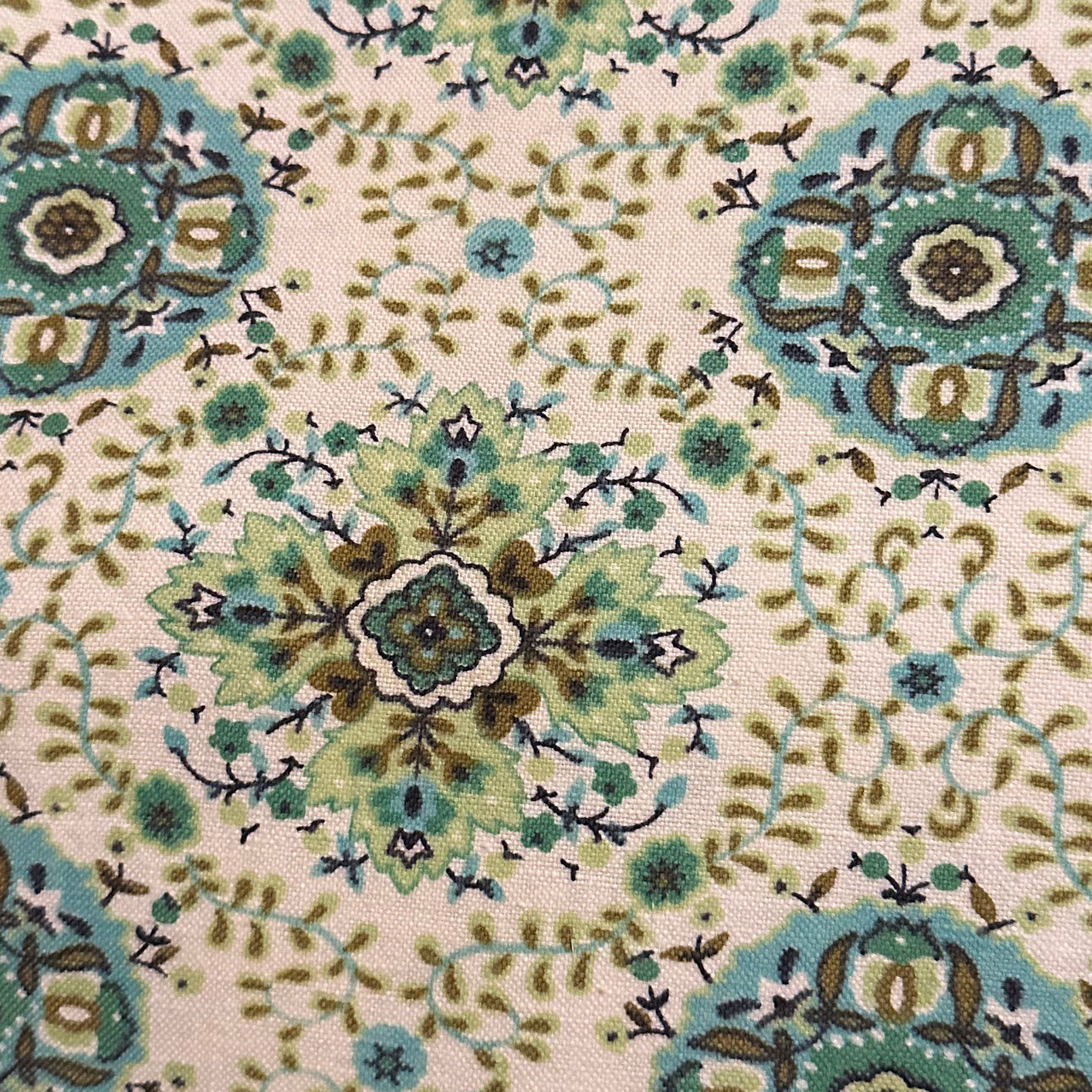 1 yard of cotton-like white vintage fabric with green and blue motif.