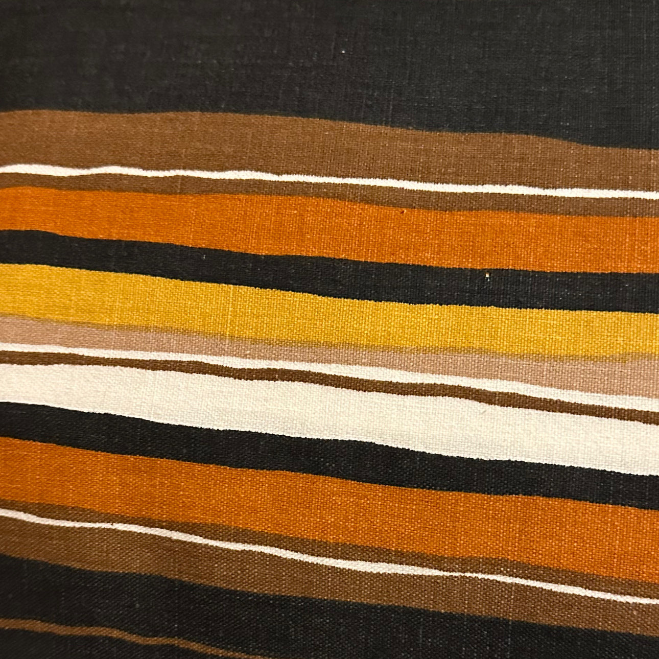 2 yards of autumnal coloured striped fabric. Strong MCM vibes with the black, white, orange, brown and natural lines. Appears to be heavy cotton.