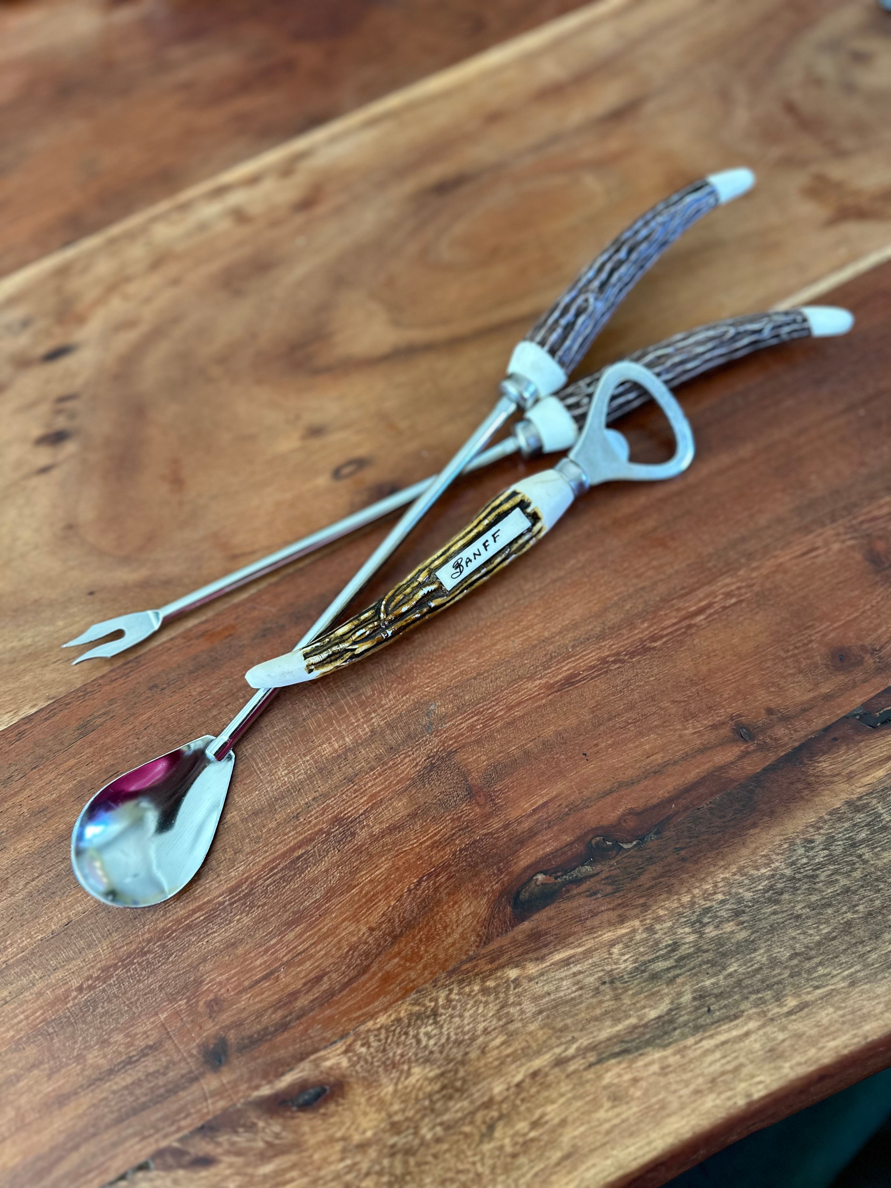 Faux antler 1970s bar set consisting of bar spoon, bar fork and bottle opener. Two available, one has “Banff” on the bottle opener.