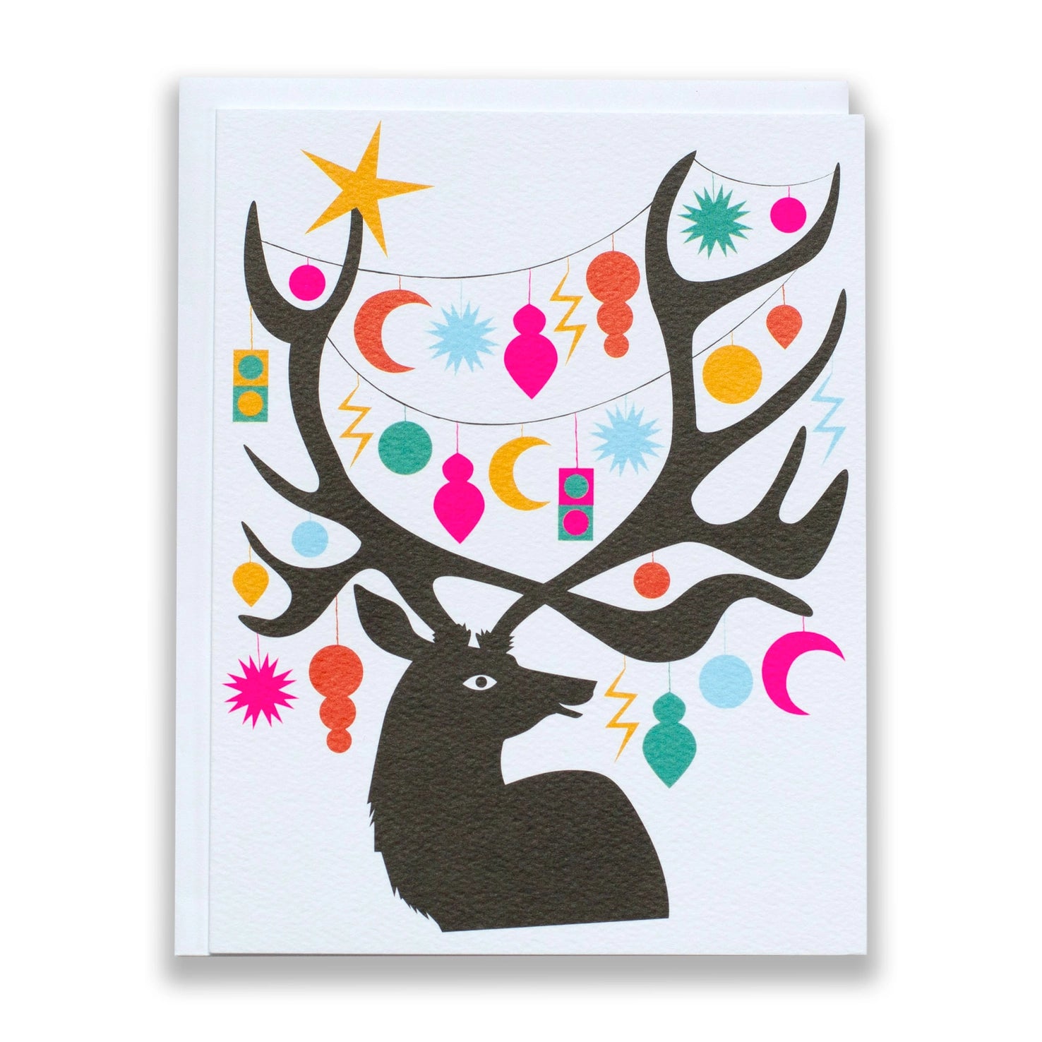Festooned with minimalist and modernist ornaments, this graphic deer is doing the holidays his way.