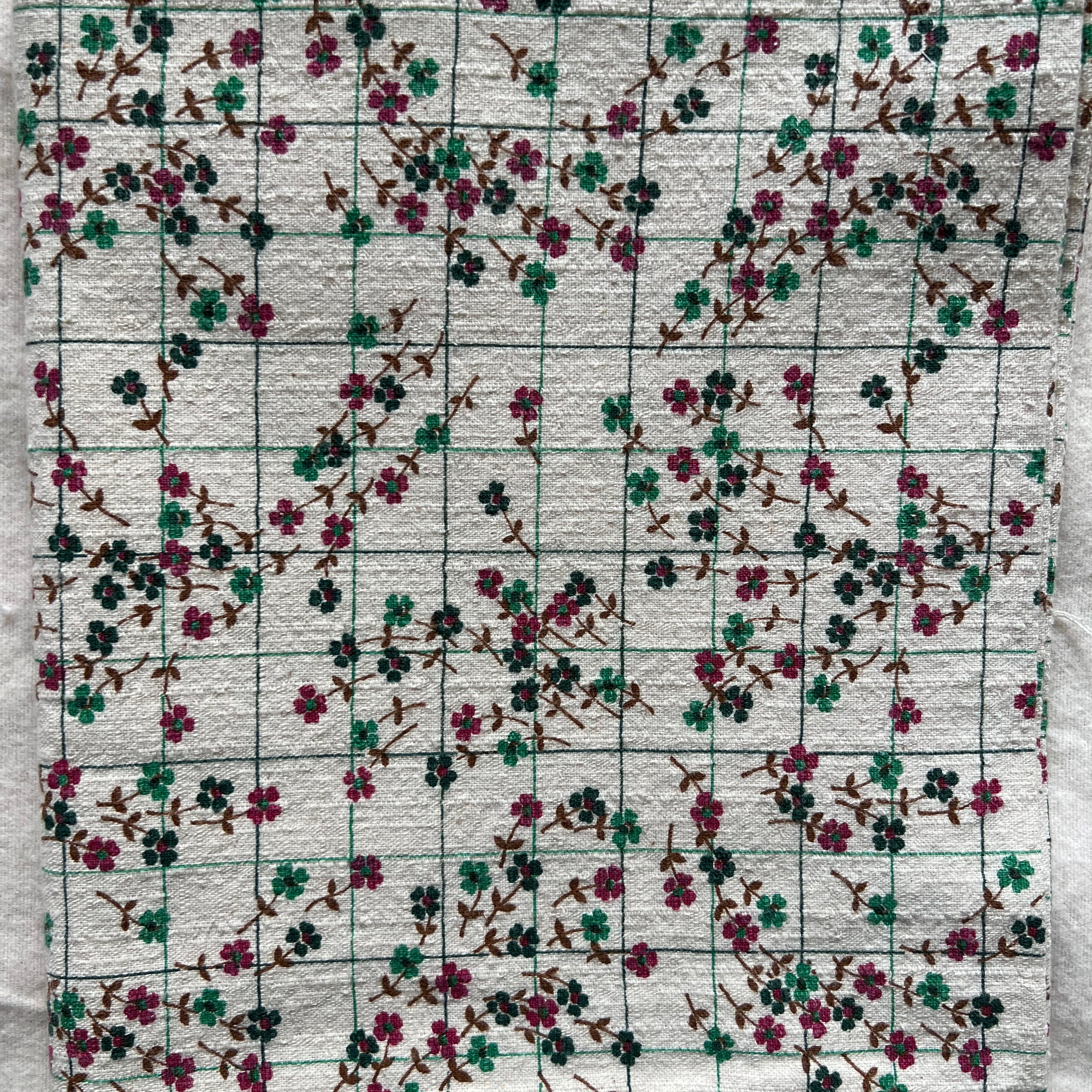 Floral and grid print on cream cotton vintage fabric - 1 yard