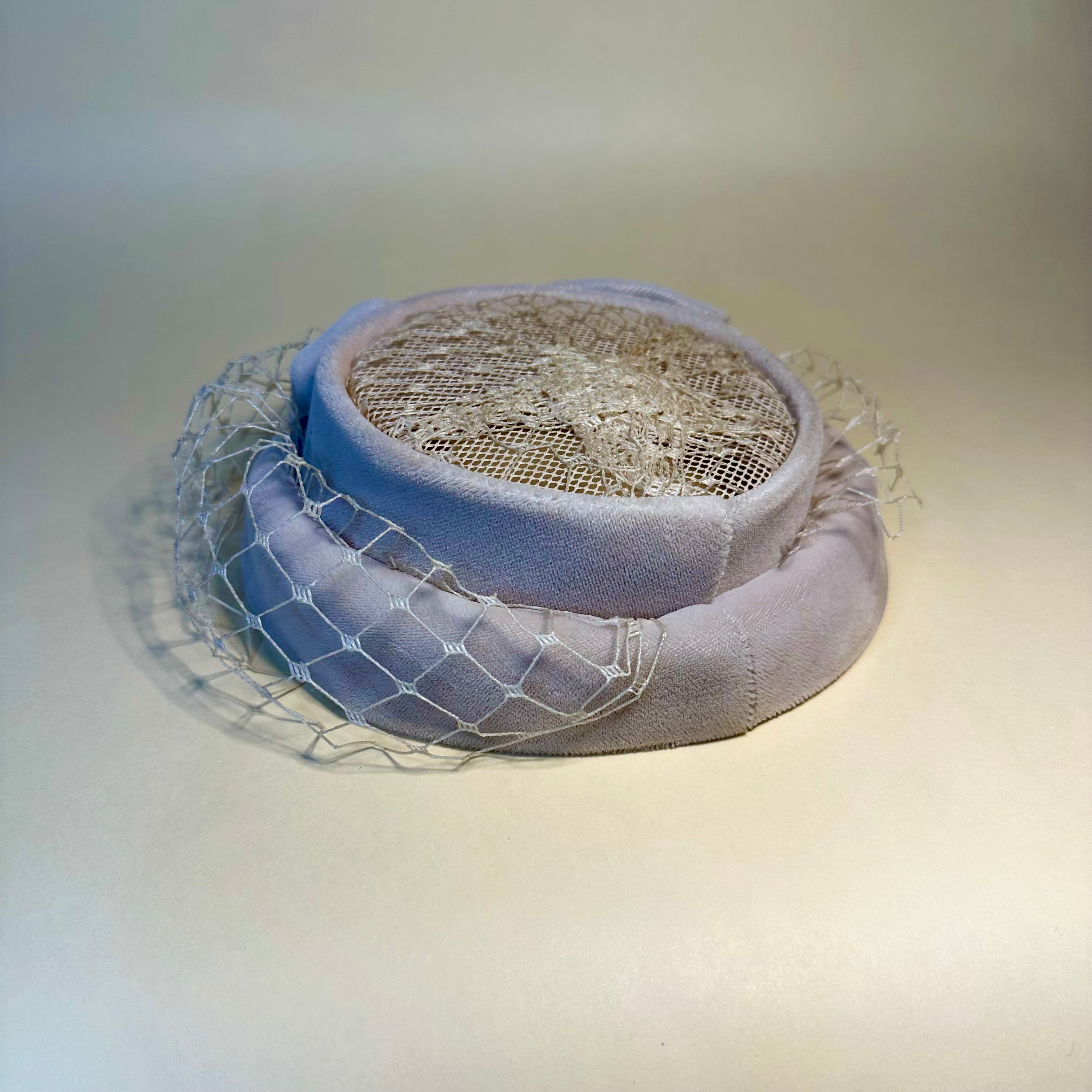 Beautiful purple velvet Spring hat in a soft violet velvet fabric with two tiers topped with an elaborately stitched netting on the top and a bird cafe style netting that can be drawn over the eyes in front. To be worn perched on the top of the head with the aid of two comb pins attached to the hat. This is believed to be either late 1950s or early 1960s and is in excellent vintage condition.