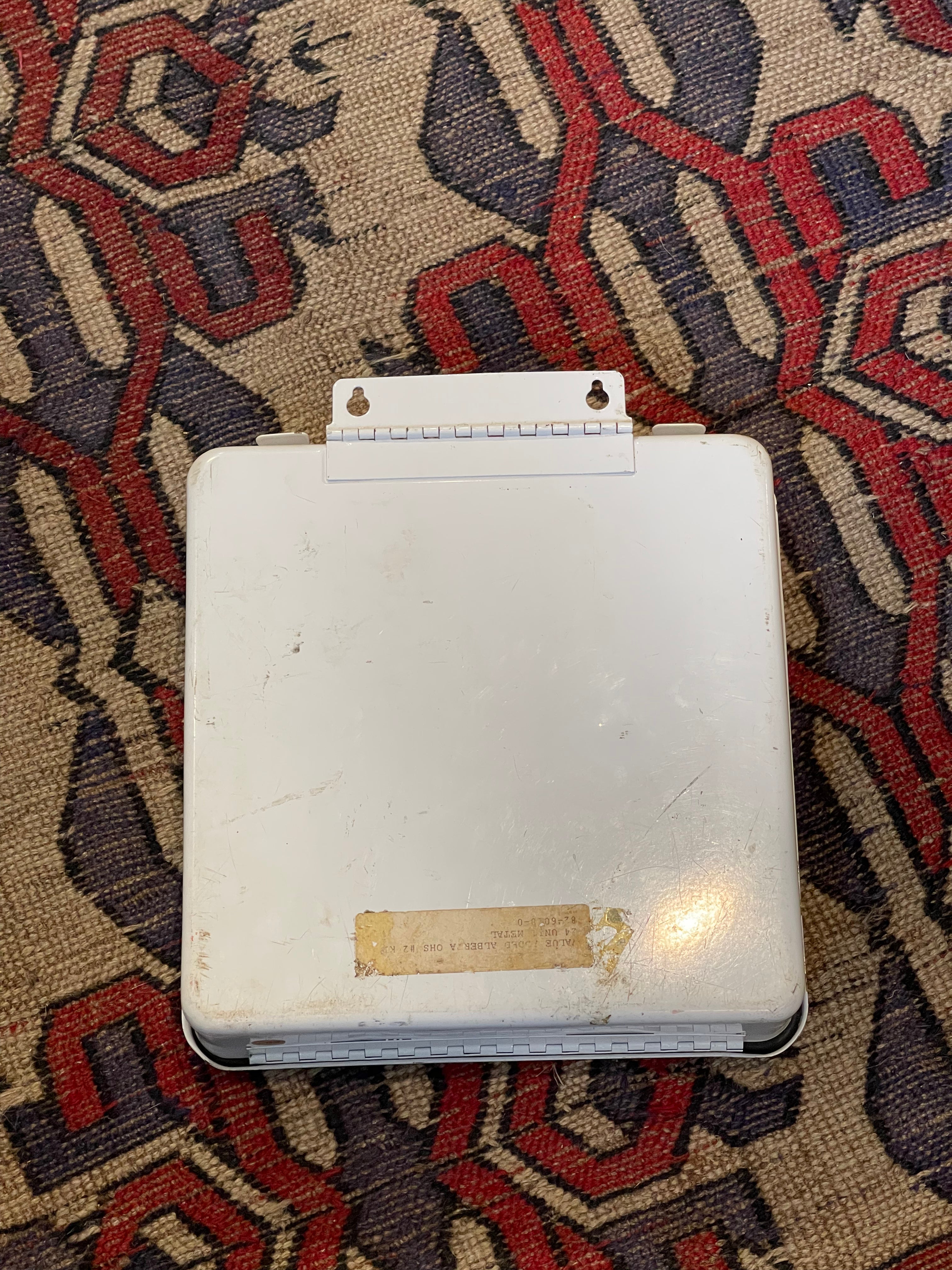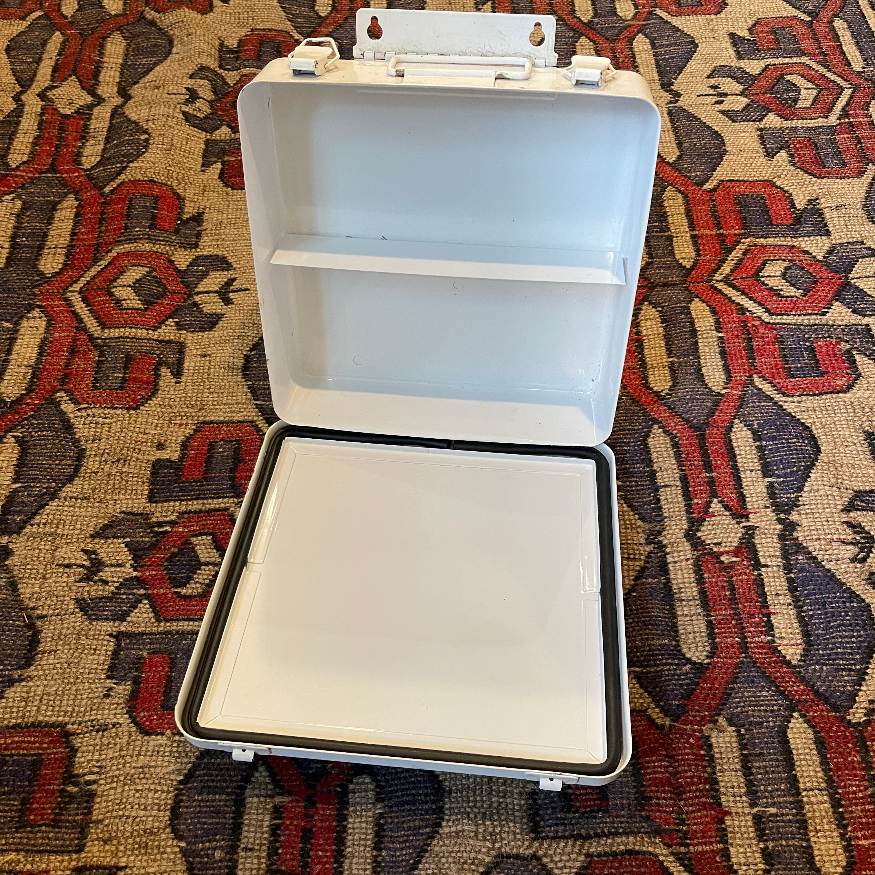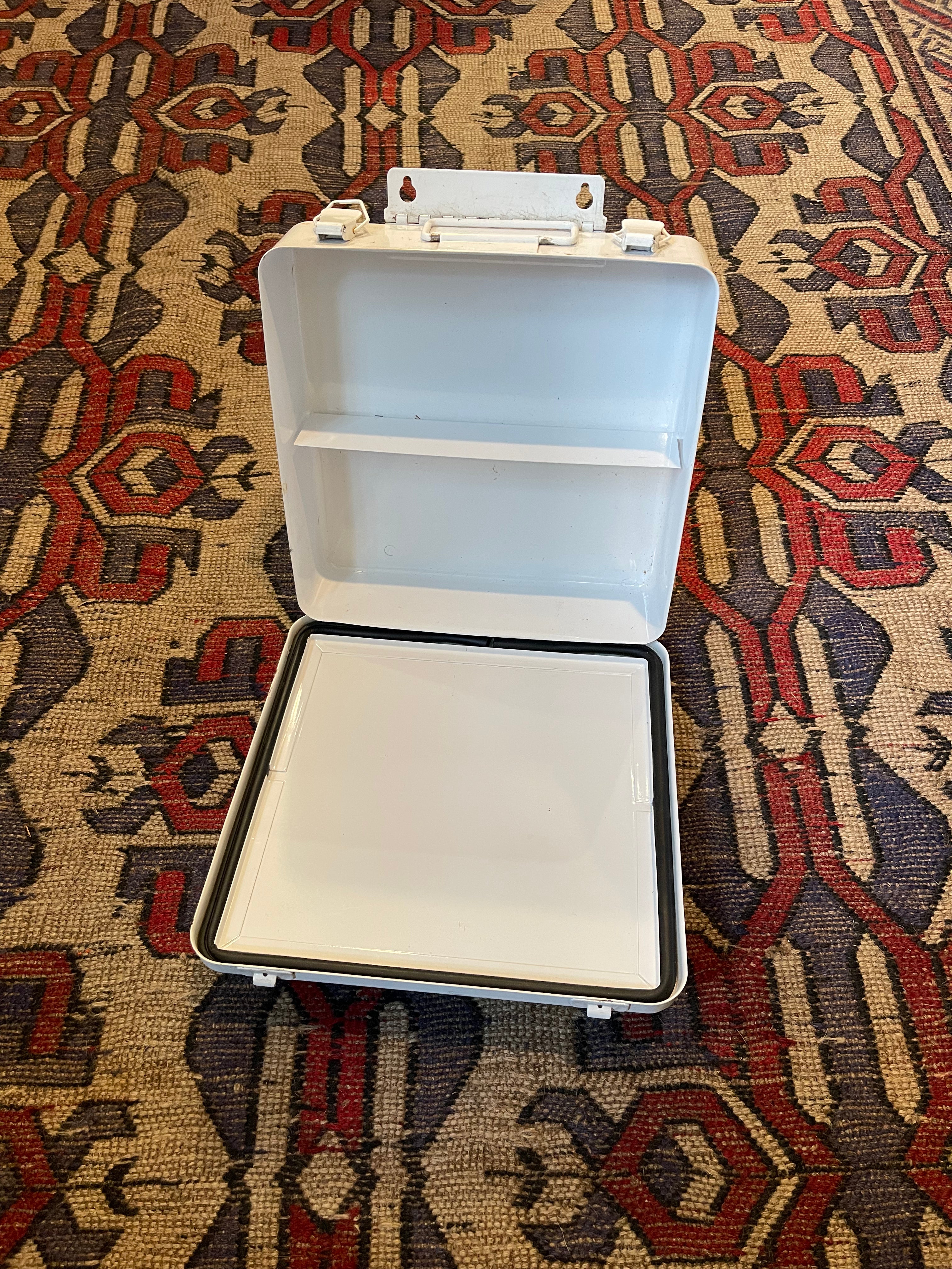 Vintage first aid kit with wall mount bracket affixed on the rear.